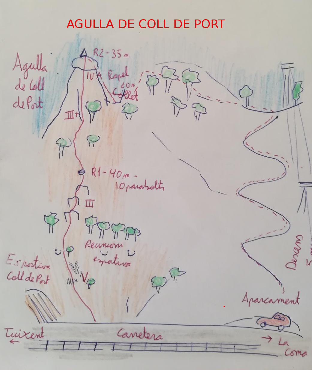A la carretera de la Coma a Tuixent uns 300 metres abans d'arribar a coll de Port ja es veu l'agulla que a la seva base té un sector d'esportiva.