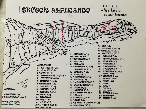 He fet les vies més fàcils de la zona... les del cursetista que estan en el sector de roca conglomerada de color rogenc (al dibuix en marca 3 però de fet són 4 que no crec que arribin a IV- encara que hi ha alguna panxa que cal mirar-se-la... em recorda molt a Riglos).Després he pujat a fer les últimes que potser són de IV. És curiós el canvi de roca doncs aquí ( i tot Alpirando) és calcari. Ara cal jugar una mica amb l'adherència del peu mentre que al conglomerat és més triar entre el munt de preses que hi ha la millor):