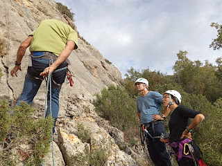 Després he pujat a fer les últimes que potser són de IV. És curiós el canvi de roca doncs aquí ( i tot Alpirando) és calcari. Ara cal jugar una mica amb l'adherència del peu mentre que al conglomerat és més triar entre el munt de preses que hi ha la millor):